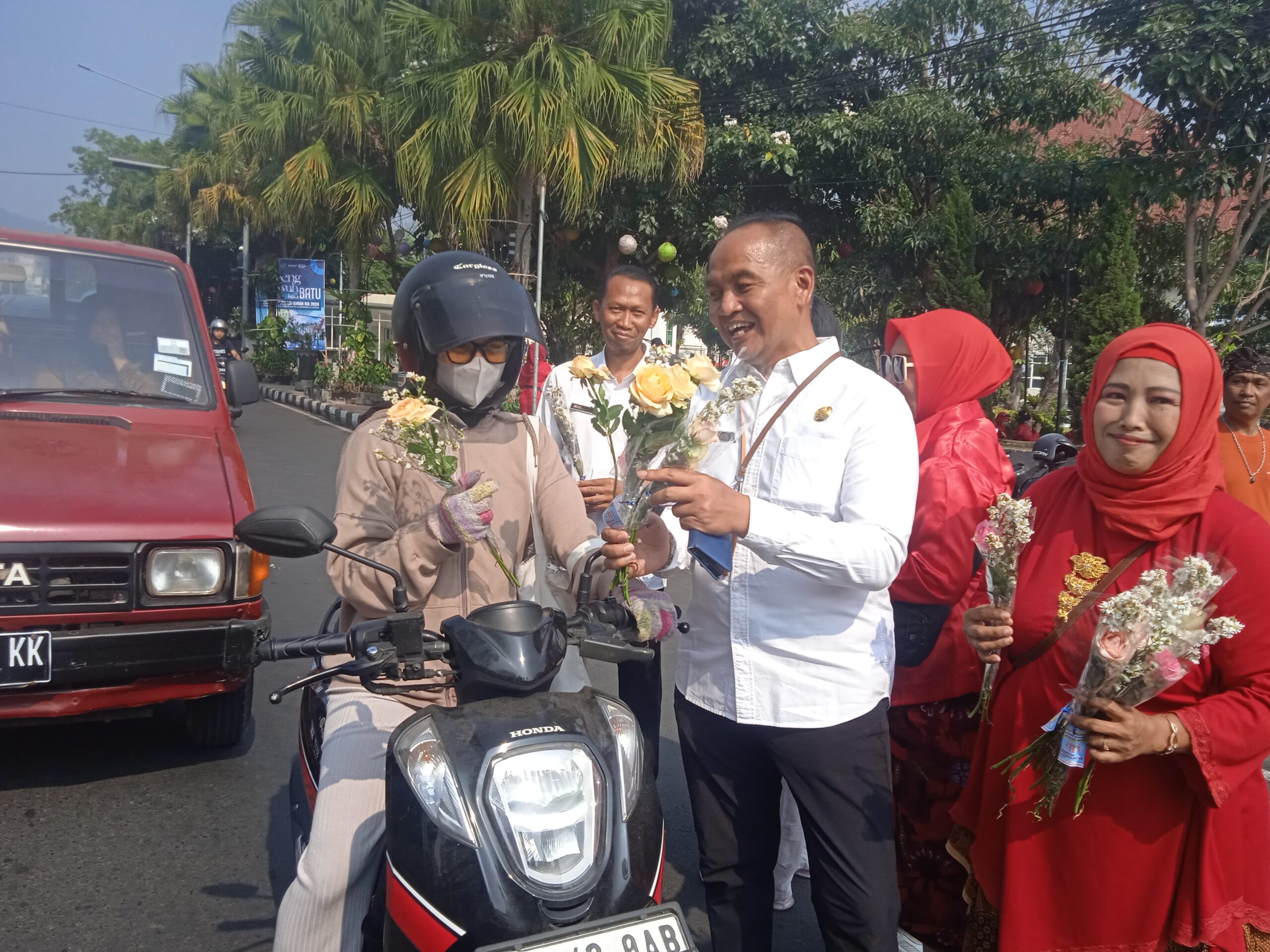 Mengawali perayaan HDI dilakukan pembagian bunga oleh penyandang disfabel kepada pengendara motor dan mobil di jalan Panglima Sudirman depan Balai Kota Among Tani.