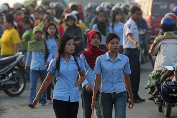 20-STA-BISNIS-01BURUH3 BISNIS/STANLIE ANDIKA DAMPAK KENAIKAN LISTRIK: Sejumlah buruh berdatangan ke tempat kerja di Mranggen, Semarang, Jawa Tengah, Selasa (20/7). Para pebisnis manufaktur mengancam akan memangkas produksi dan tenaga kerja besar-besaran mulai pertengahan Agustus akibat terimpit oleh skenario penaikan harga listrik indusri oleh PT PLN (Persero).