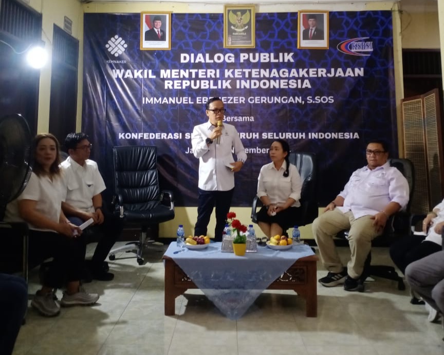 Jakarta – Sebagai pejabat baru dalam jajaran Kementerian Tenaga Kerja, Imanuel Ebennezer Gurungan, S.SOS yang menjabat sebagai Wakil Menteri Tenaga Kerja ( Wamenaker ) yang didampingi Penta selaku Staf Khusus berkunjung dengan bersilaturahmi ke kantor Dewan Eksekutif Nasional ( DEN ) Konfederasi Serikat Buruh Seluruh Indonesia ( KSBSI ) jalan Cipinang Muara Raya nomor 33 Jatinegara – Jakarta Timur, Selasa ( 12/11/2024 ).