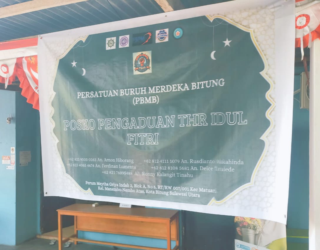 Dalam pertemuan yang dihadiri 5 organisasi buruh/pekerja tersebut menyepakati dalam pembentukan posko pengaduan THR dalam satu Koalisi yakni Persatuan Buruh Merdeka Kota Bitung (PBMB). Hadir dalam pertemuan tersebut diantaranya, Arnon Hiborang Ketua Sakti Sulut, Ferdinand Lumenta Ketua SPMI Bitung, Deice tatalede Ketua Serikat Perempuan Pekerja Perikanan Sulut, Rusdyanto Makahinda Ketua FSB Kamiparho Bitung.