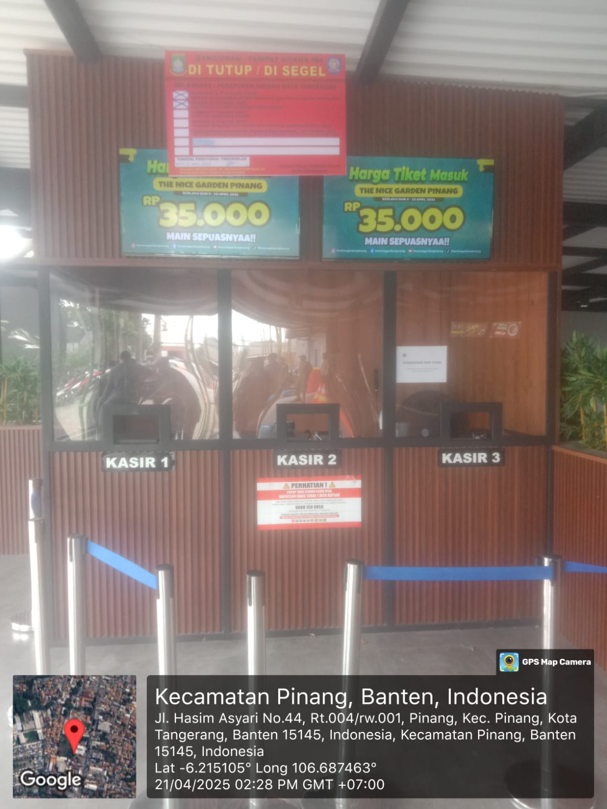 Kota Tangerang, lingkarmedia.com – Tempat wisata keluarga The Nice Garden Pinang yang berada di jalan KH Hasyim Ashari No. 9A RT/RW 004/001 Kelurahan Pinang Kecamatan Pinang Kota Tangerang disegel pihak Satuan Polisi Pamong Praja (Satpol PP) Tangerang Kota, Senin (21/4/2025).