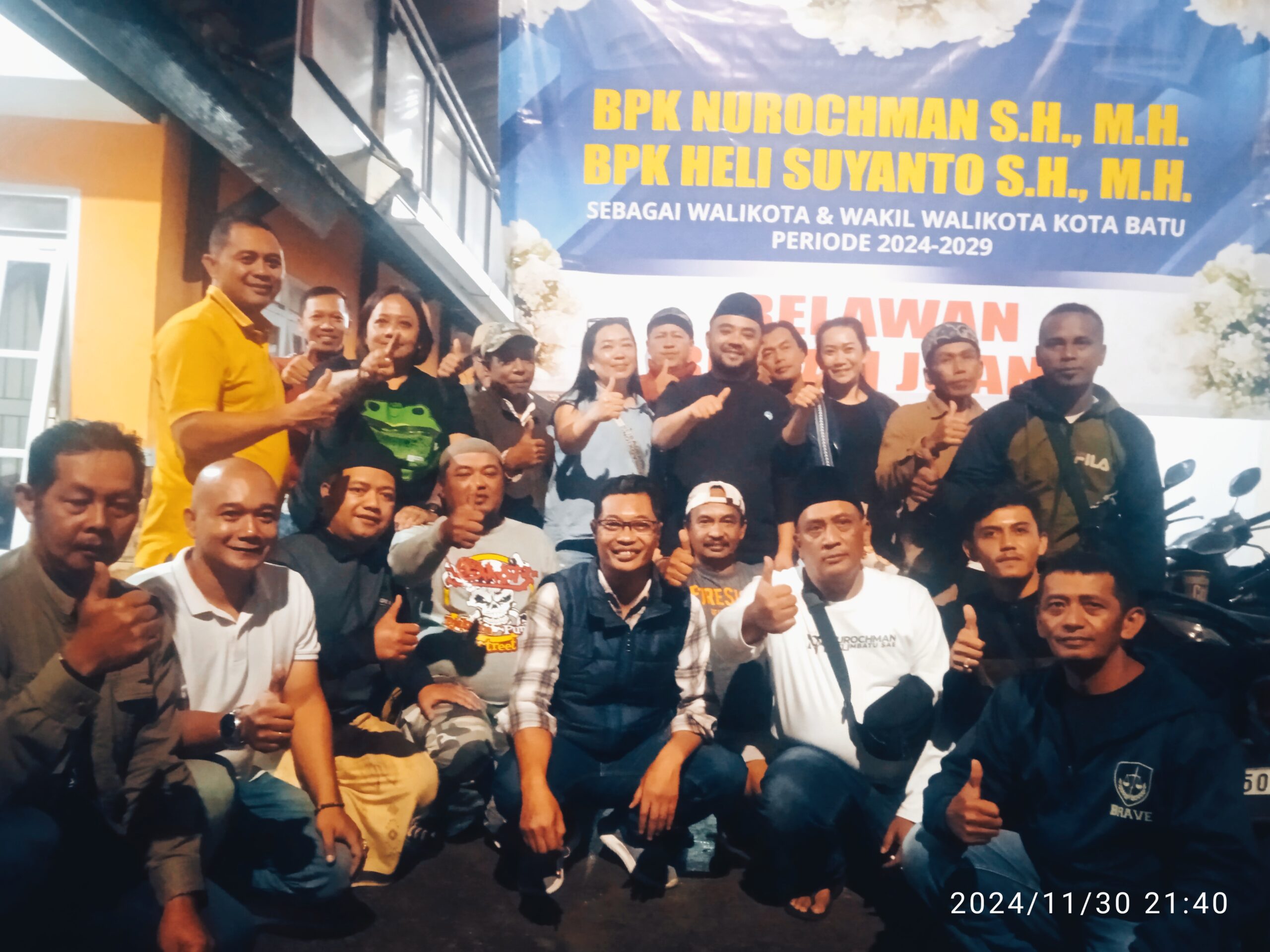 Kota Batu – Perayaan atas kemenangan calon Wali Kota dan Wakil Wali Kota Batu Nurochman – Heli Suyanto terus dilakukan kelompok – kelompok relawan pendukungnya. Kali ini relawan rumah juang menggelar tasyakuran kemenangan Cak Nur – Heli di posko pemenangan di Jalan Abdul Jalil , kelurahan Sisir Kecamatan Batu pada Sabtu ( 30/11/2024 ) malam.