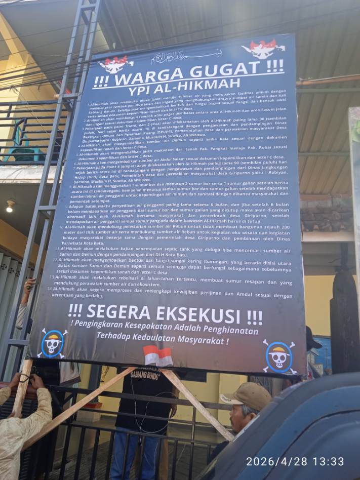 Sejak siang hari, warga mulai berkumpul dengan membawa berbagai spanduk dan banner berisi tuntutan. Mereka menyuarakan aspirasi secara tertib dan damai, namun tetap tegas dalam mendesak pihak Yayasan Al-Hikmah untuk segera merealisasikan isi kesepakatan. Spanduk yang dibentangkan juga memuat secara rinci 14 poin hasil kesepakatan sebagai bentuk pengingat atas komitmen yang telah dibuat bersama.